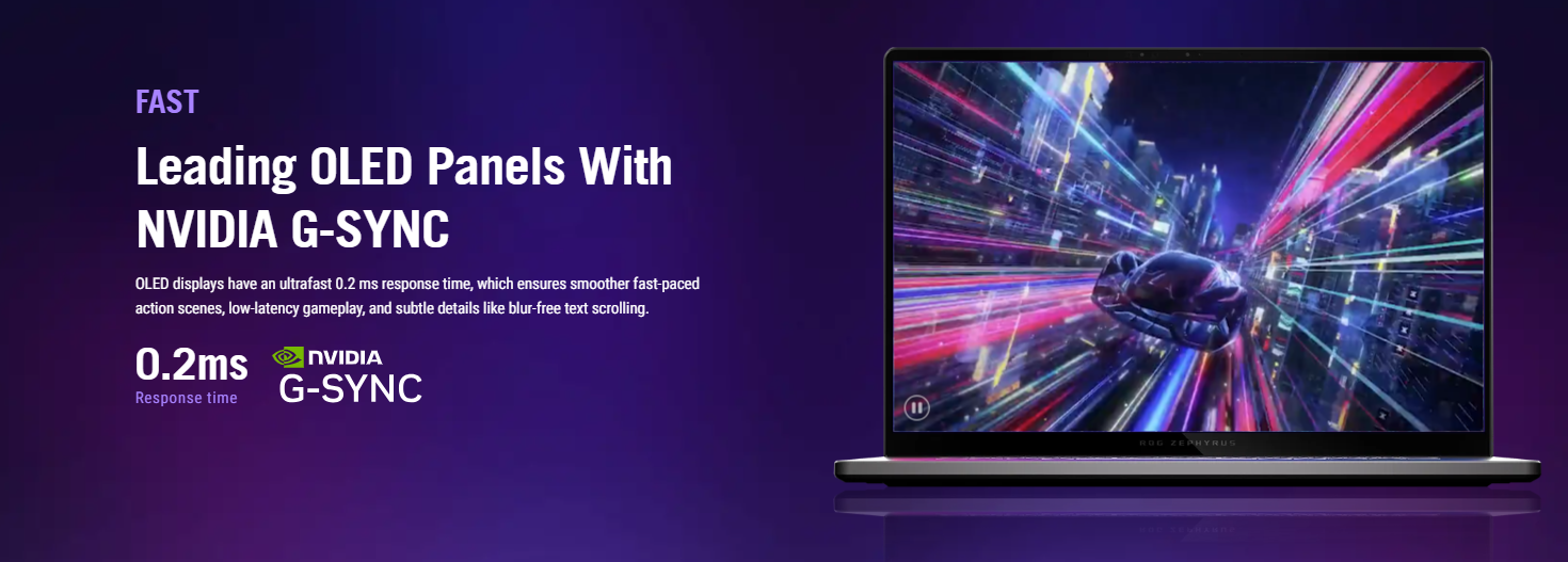- 16″ 2.5K (2560 x 1600, WQXGA), OLED, Glossy, DCI-P3: 100% Refresh Rate: 240Hz, Response Time: 0.2ms, G-Sync, Pantone Validated
